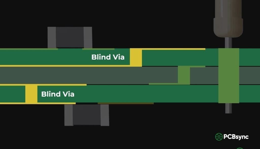 This is exactly where blind vias come in. A blind via connects an outer layer of a PCB to one or more inner layers without passing through the entire board. Unlike through-hole vias that punch from top to bottom, blind vias are visible from only one side — hence the name “blind.”