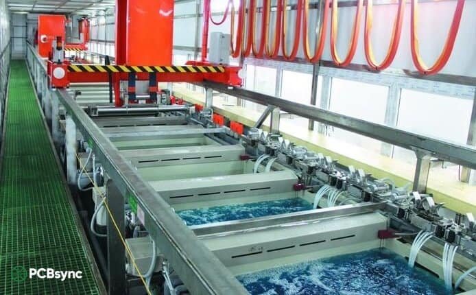 Electrolytic copper plating builds up additional copper on exposed surfaces—the circuit traces and hole interiors. The panels are immersed in copper sulfate solution while electrical current drives copper ions onto the conductive surfaces.